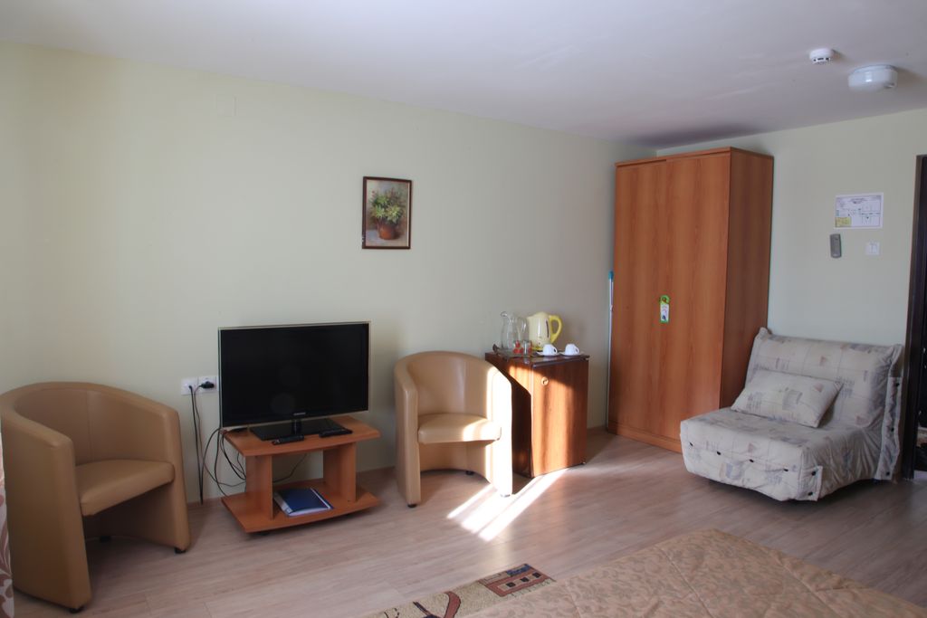 В номере: кровать одноместная, тумба прикроватная, шкаф, кресло, стол, спутниковое телевидение, кондиционер, холодильник, электрочайник