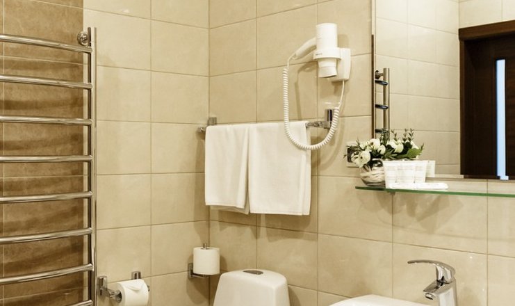 В номере: вешалка, кресло, кровать двуспальная, прикроватные тумбочки, стол, стулья, шкаф, кондиционер, телевизор ЖК, телефон, холодильник, чайный набор посуды, электрочайник