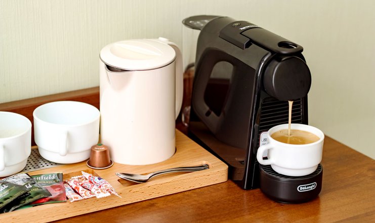В номере: вешалка, кресло, кровать двуспальная, прикроватные тумбочки, столик журнальный, шкаф, кондиционер, кофемашина: капсульная, телевизор ЖК, телефон, холодильник, чайный набор посуды, электрочайник