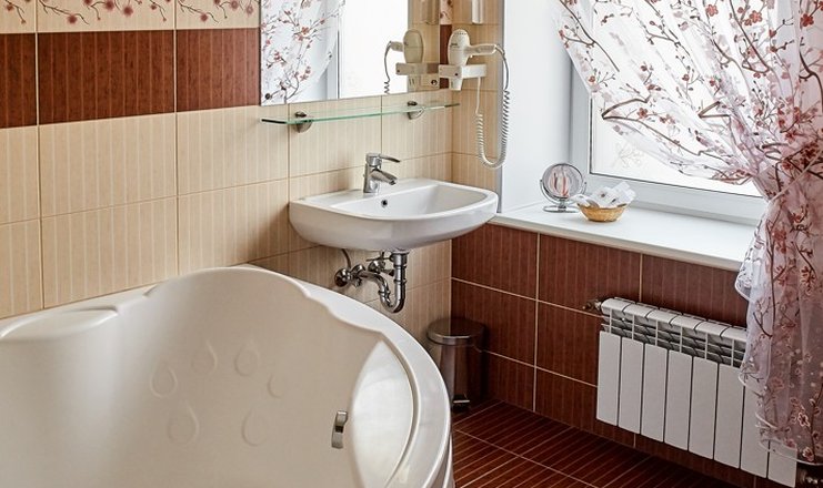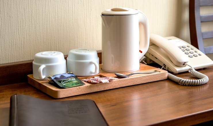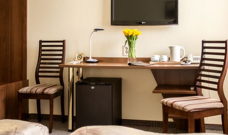 В номере: вешалка, кровать двуспальная, прикроватные тумбочки, стол, стулья, шкаф, телевизор ЖК, телефон, холодильник, чайный набор посуды, электрочайник